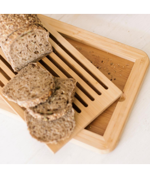 La planche à découper à pain avec grille amovible est en bambou et se distingue par sa forme rectangulaire aux bords arrondis et sa grille amovible.