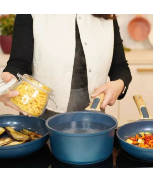 Ce pack contient une casserole 20cm, une poêle 24cm, une poêle 28cm, 2 poignées détachables et 2 feutrines de protection.