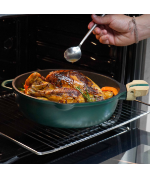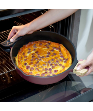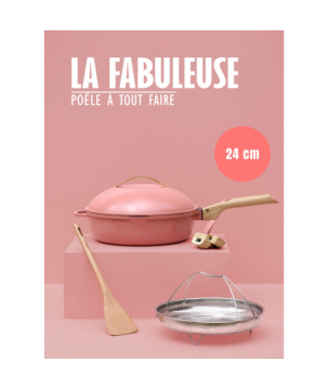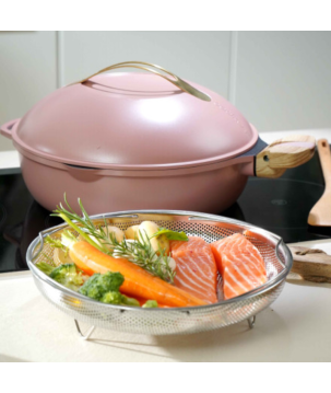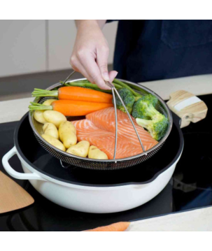 Inclus: 2 poignées détachables (une longue et une courte), un panier vapeur et une spatule en bois.