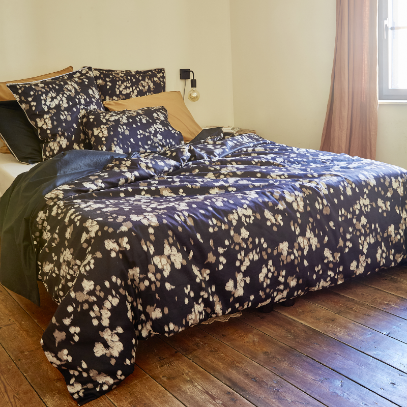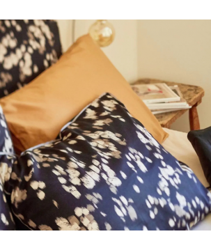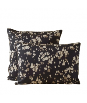 Cette parure de lit modernise le motif floral grâce à un effet estompé qui le transforme en un dessin proche de l’abstraction et libre d’interprétation. Certains y verront des nuages, d’autres les taches d’un animal exotique, d’autres enfin les lumières dans la nuit. Imprimé sur un élégant satin de coton noir, il est accompagné d’un délicat passepoil de reps. Il apportera un style raffiné et moderne à votre chambre.