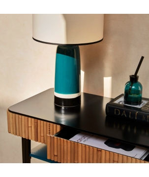 Toujours élégante, Sicilia se coiffe d’un abat-jour en coton pff-White bordé d’un liseré noir, qui apporte de la tenue à la lumière. Cette lampe majestueuse habille votre intérieur en diffusant une lumière douche et chaleureuse.